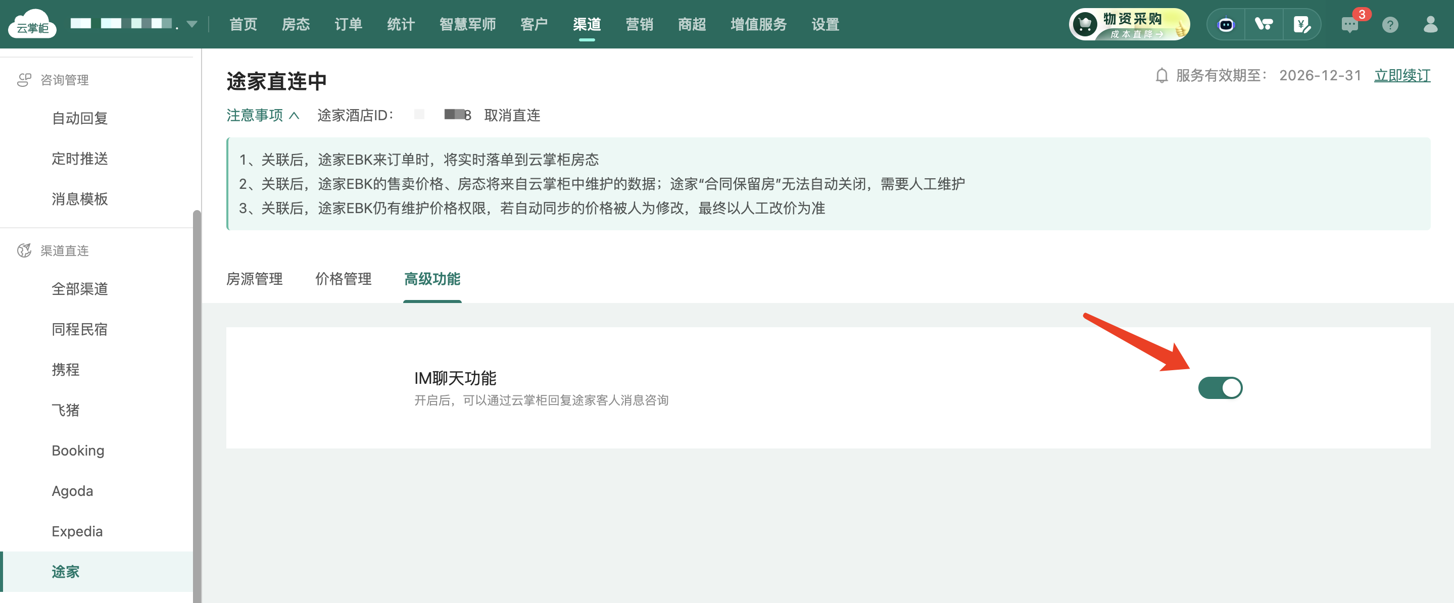 登录云掌柜PC端,进入「渠道」模块,开通直连,打开IM聊天功能。(下面以途家民宿为例)