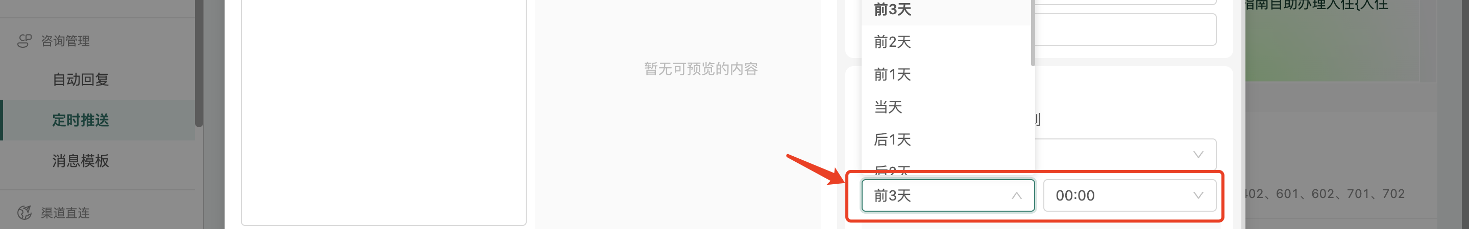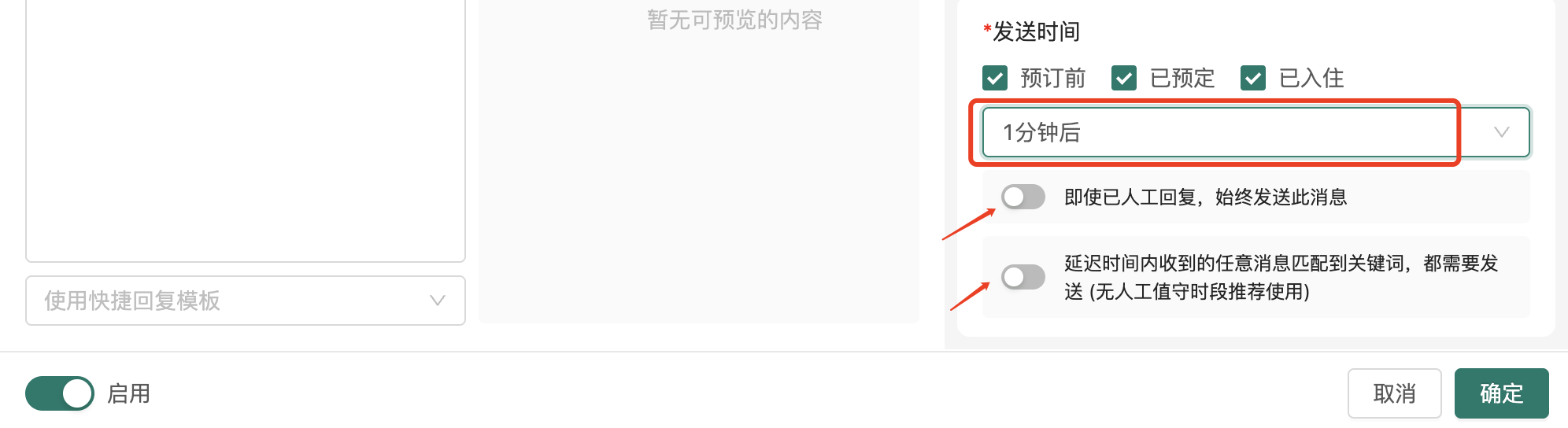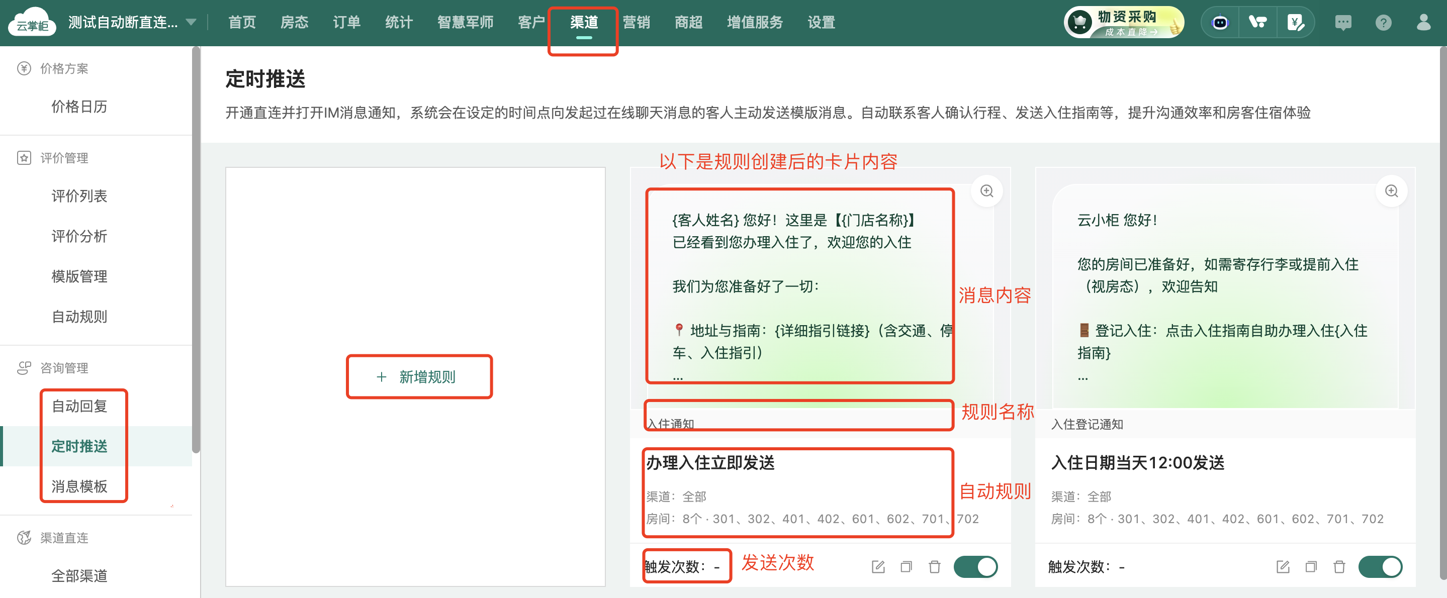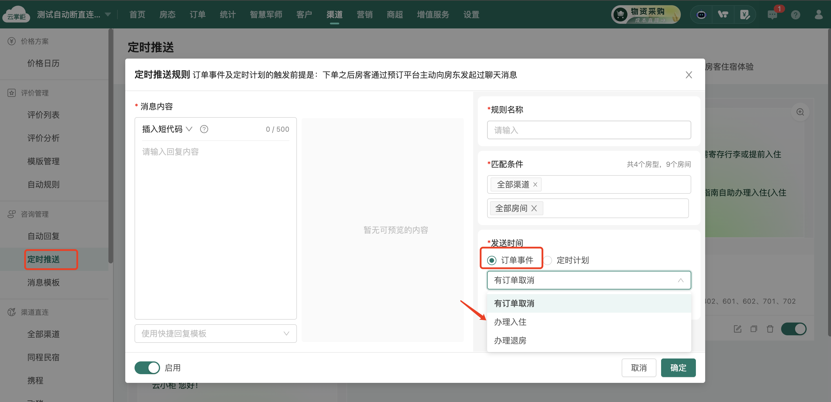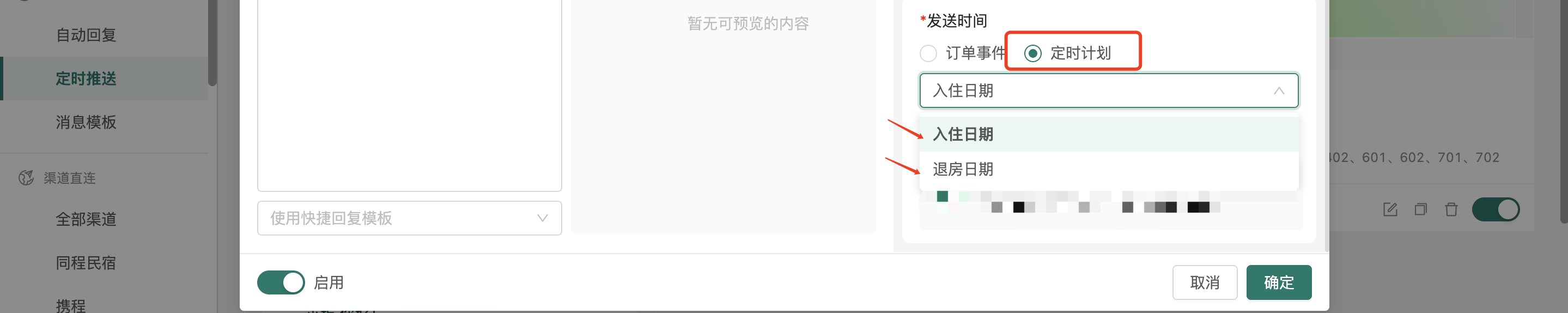 定时计划:关联“订单的入住、退房时间”,按计划发送时间发送