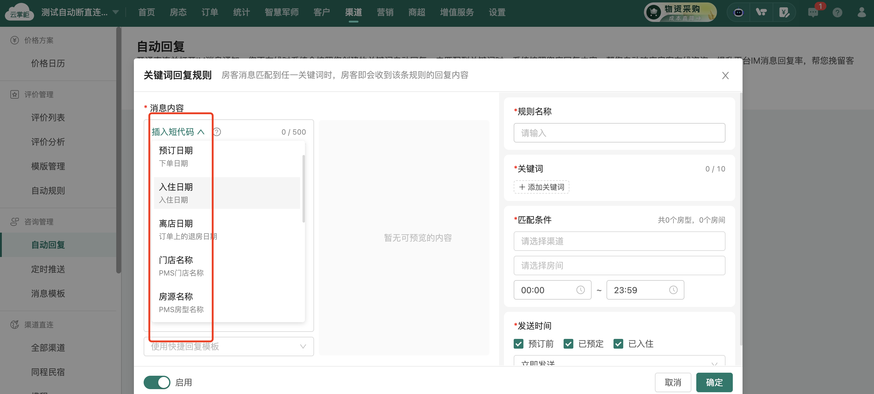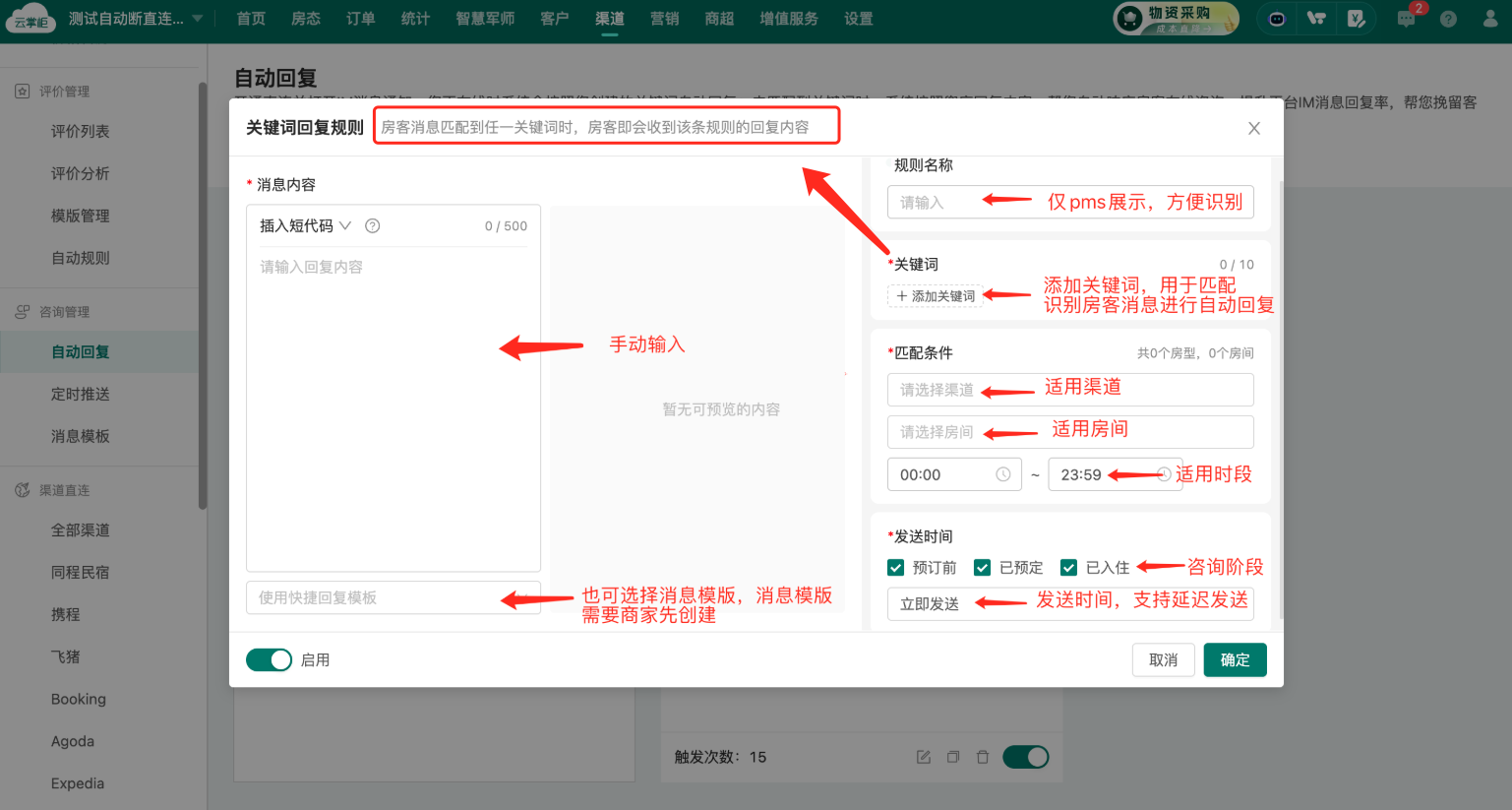 开通渠道直连,通过PMS设置自动化规则,可以实现自动回复房客消息,订单不同节点向房客主动推送服务通知,帮商家降低运营成本、提升消息及时回复率,同时提升房客入住体验