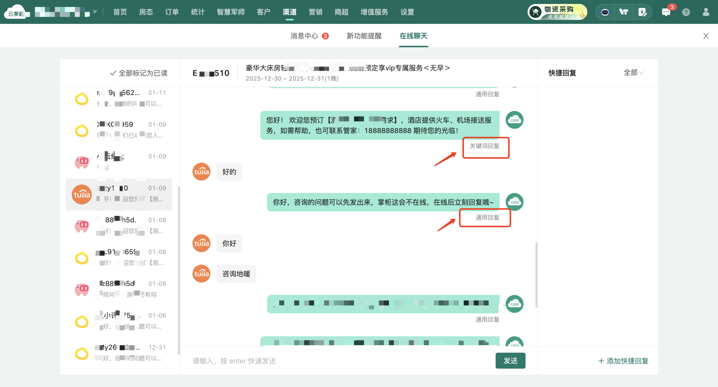 需要注意:若下单后房客没咨询过,则无法触发消息;需先到渠道平台发起对话