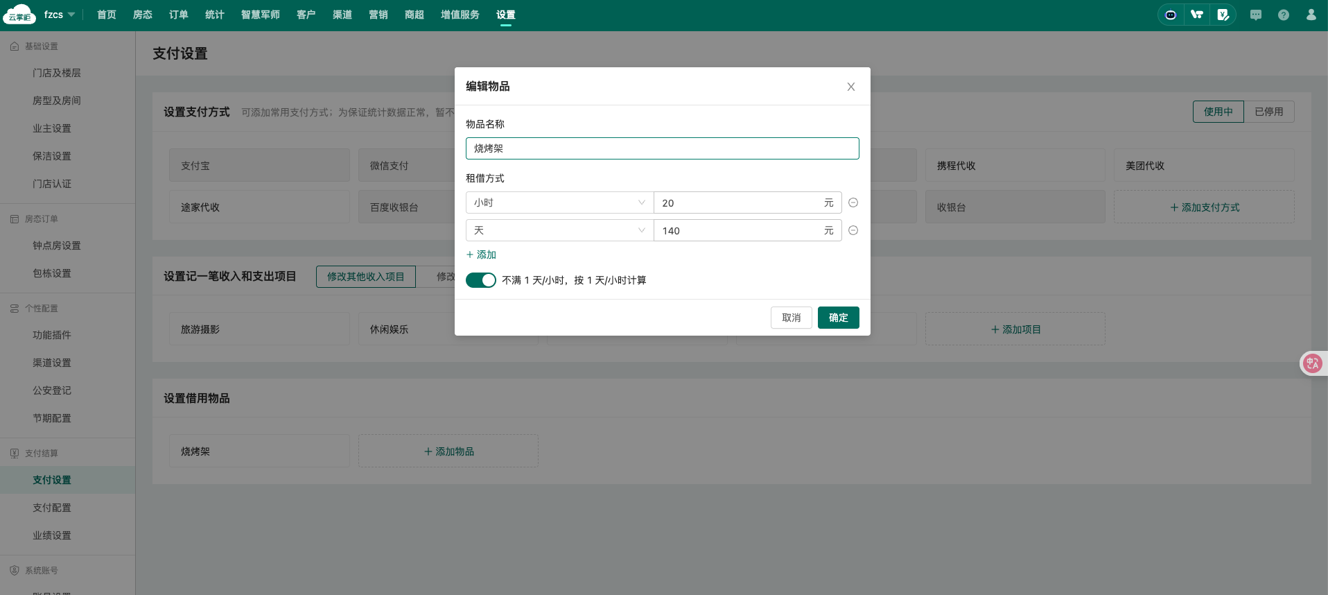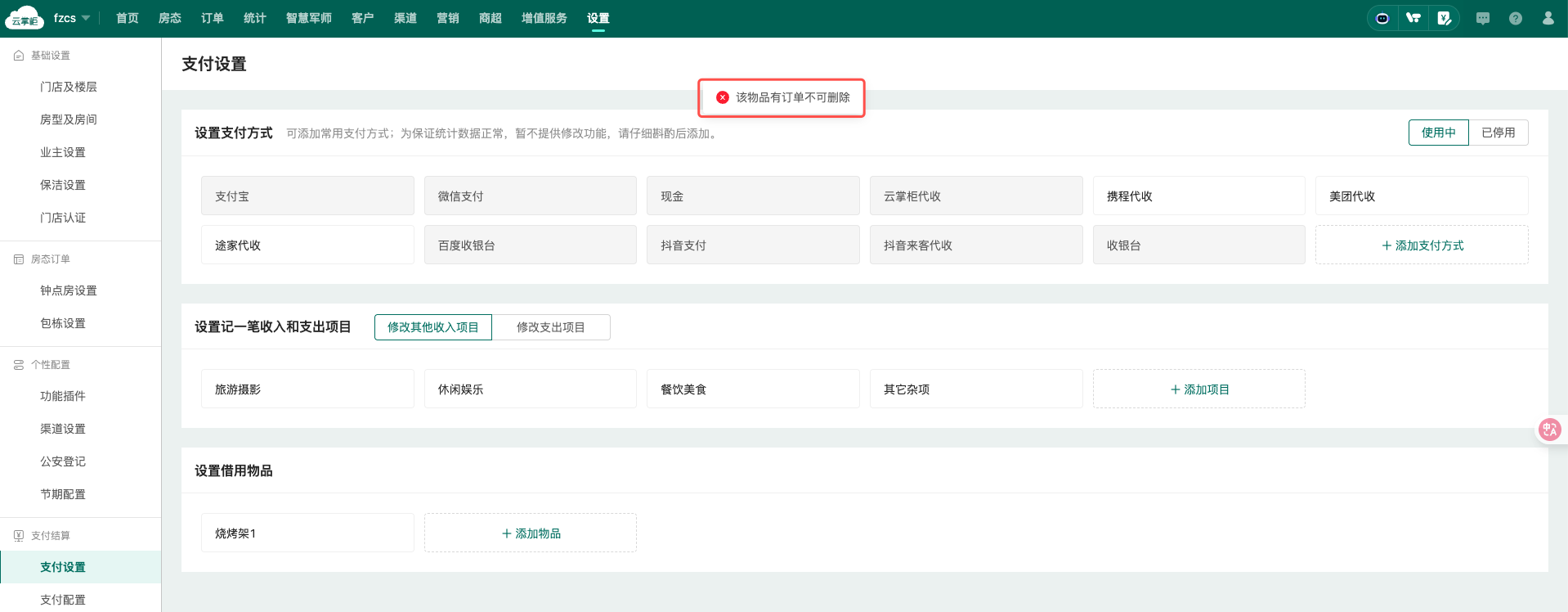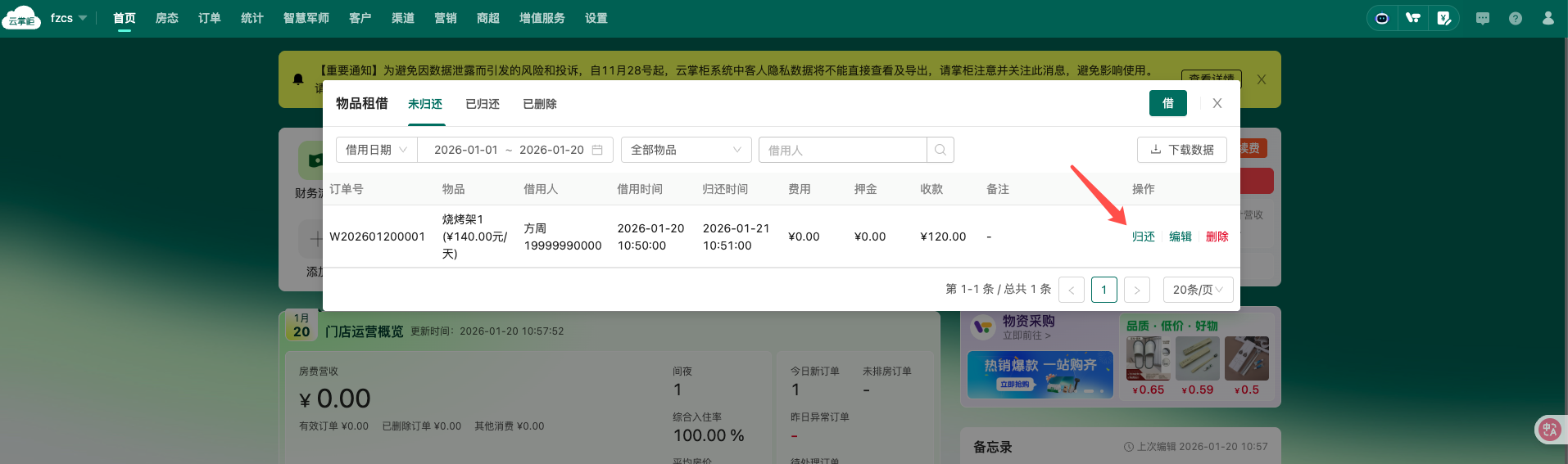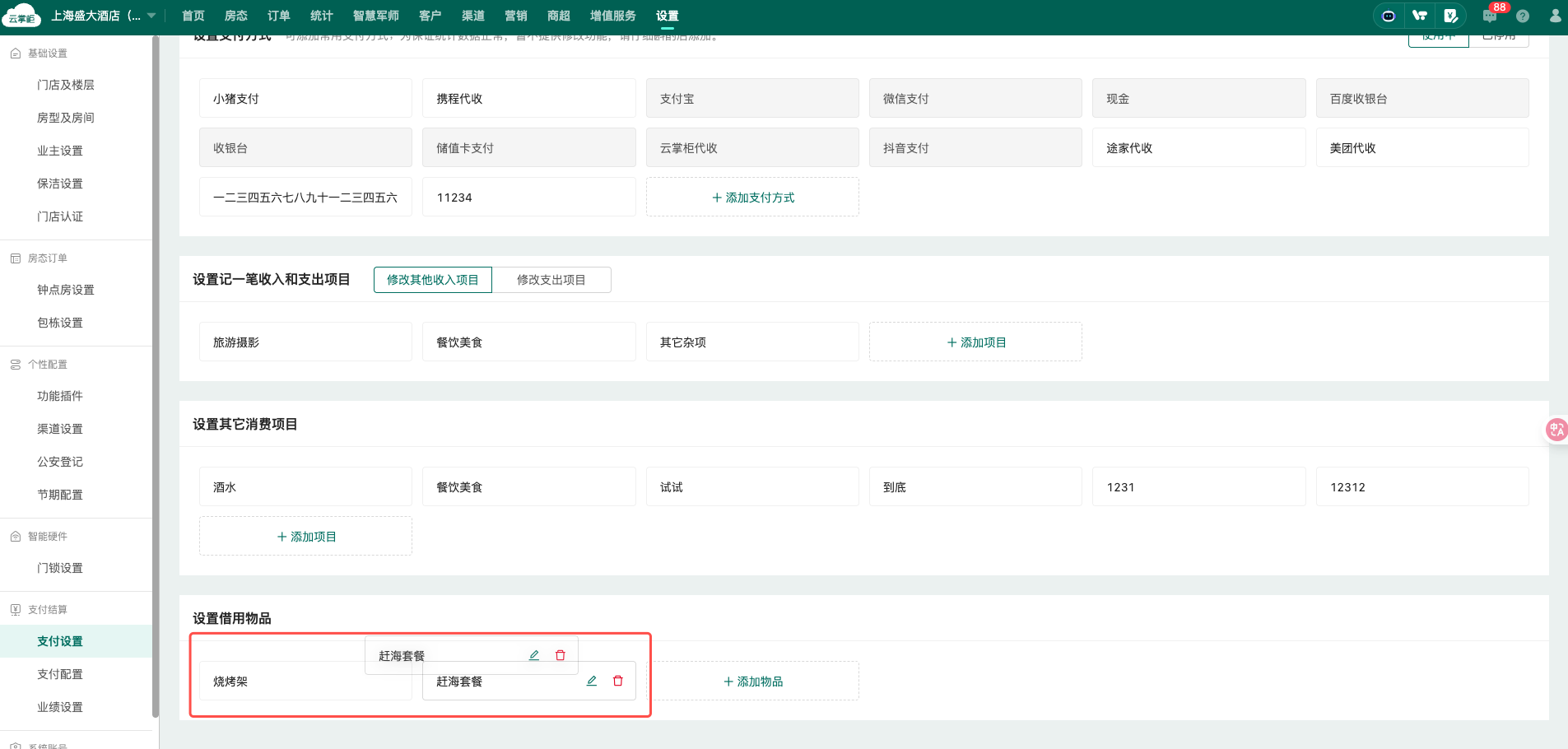酒店或民宿有向客人租借充电宝、赶海工具、烧烤设备等场景,可通过系统管理物品及物品订单
