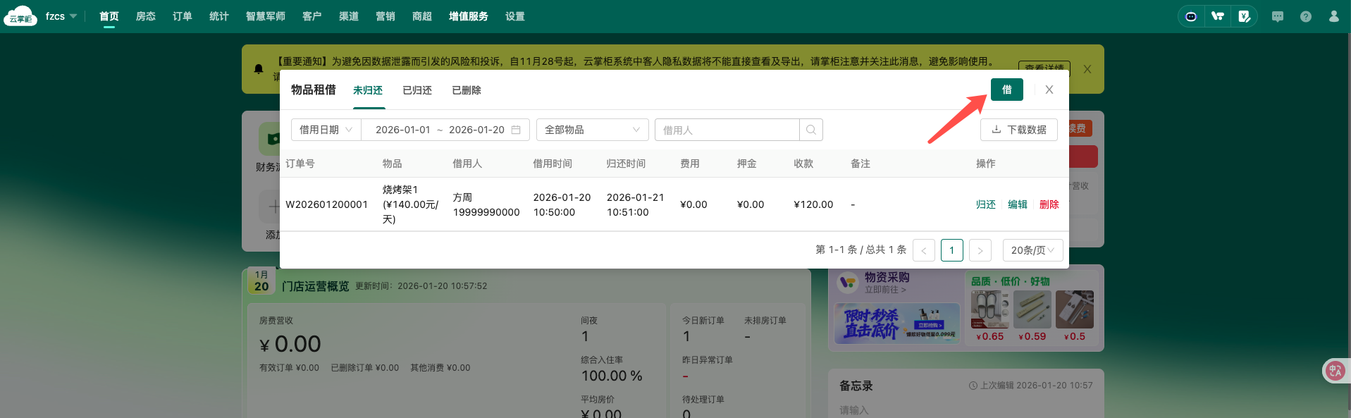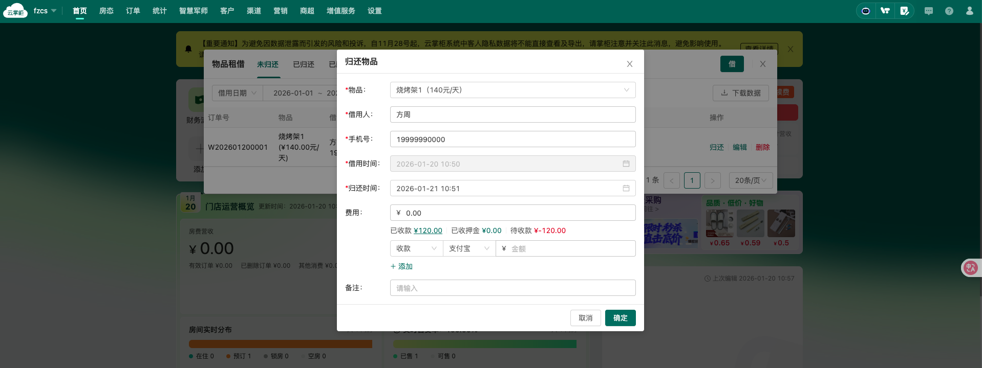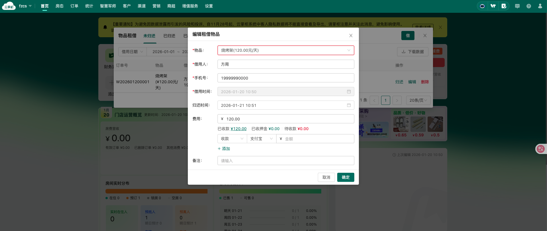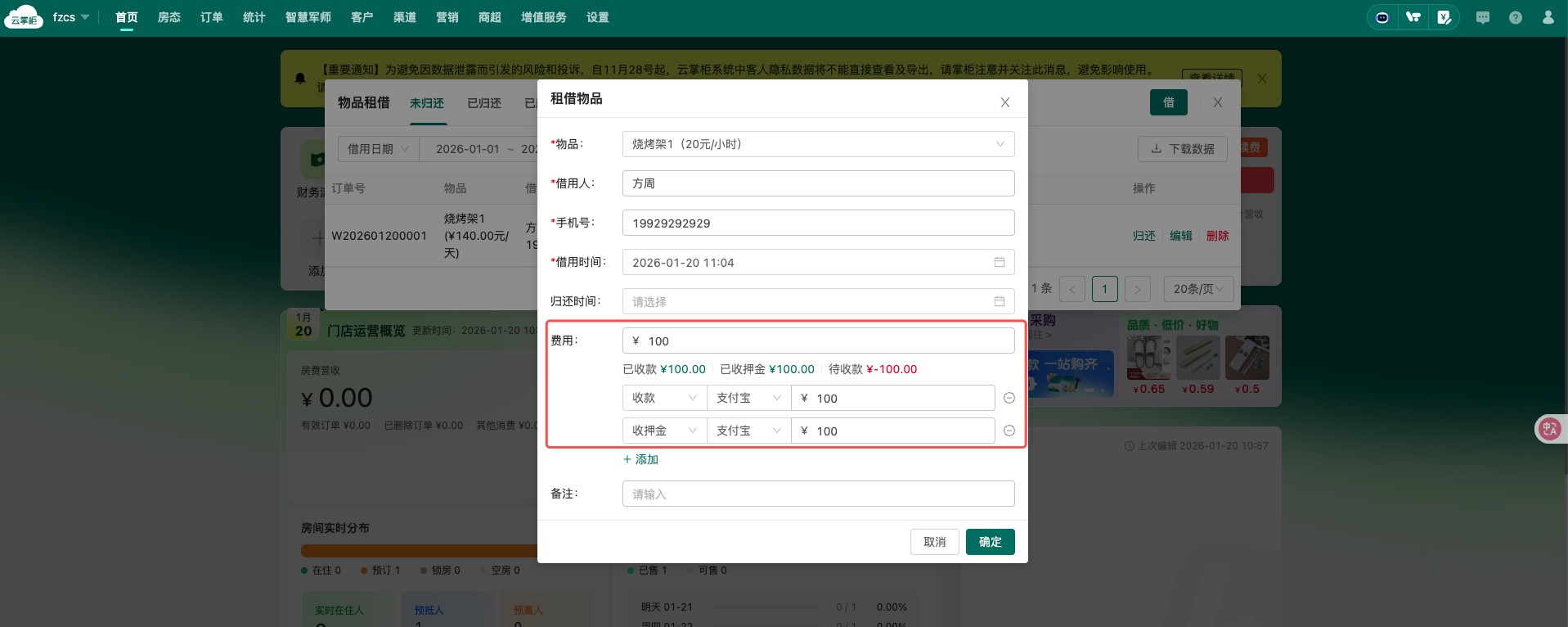 借用时,可选择收款及收押金,暂不支持收银台及储值卡;整体逻辑与客房订单一致,会自动计算待收款