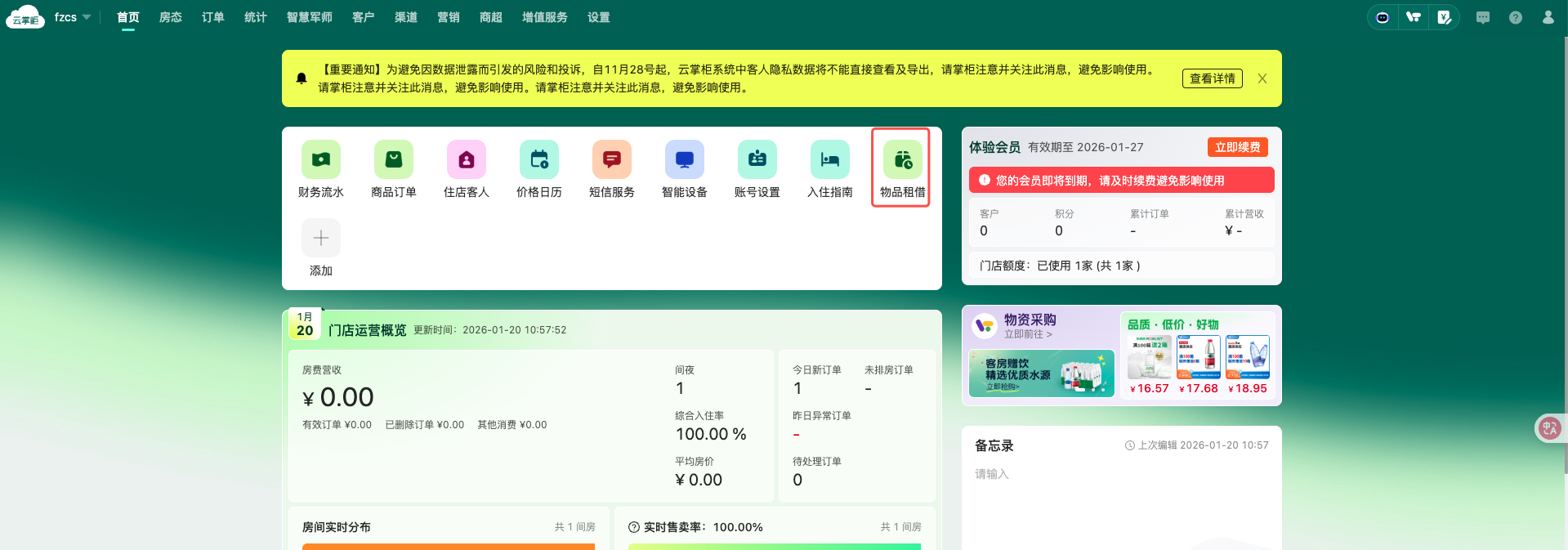 可在“首页”-“物品租借”进行物品订单管理;若您没有操作权限请联系主账号设置“物品租借”订单权限