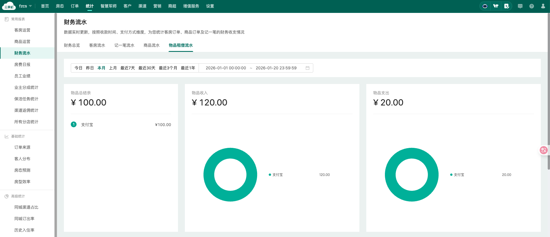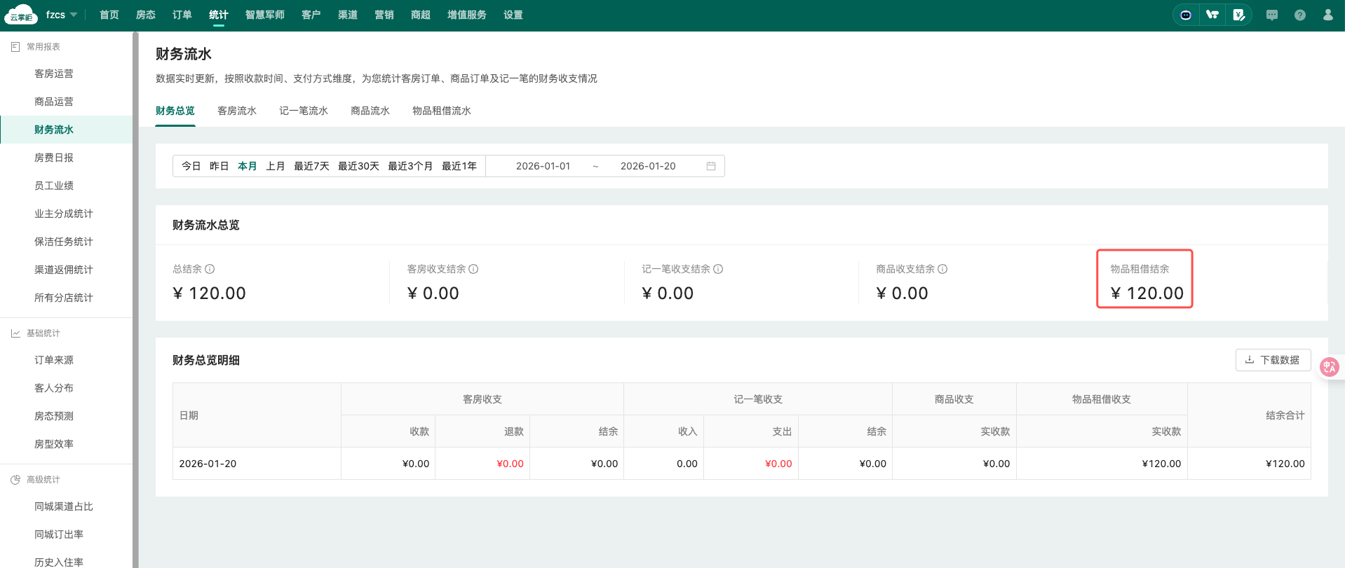 财务流水:财务总览及物品租借流水新增物品订单相关数据