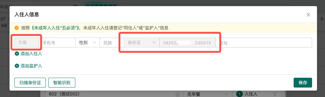 2、非智能识别或扫描身份证方式录入的入住人不允许办理入住