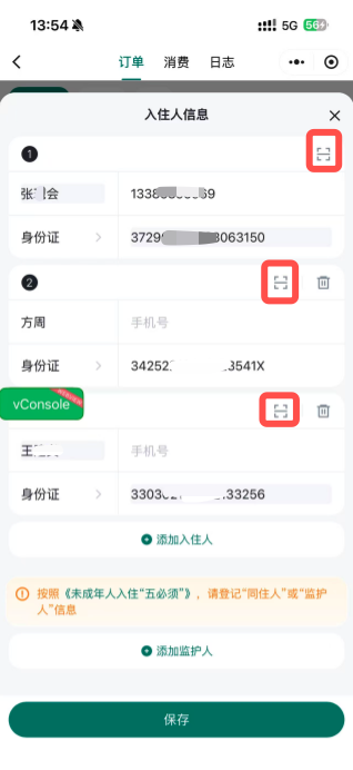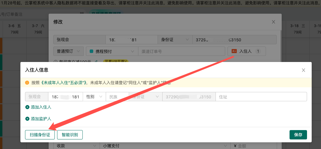 通过扫描身份证的方式录入入住人信息