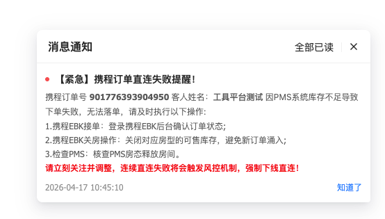 订单直连失败PMS通知内容及样式