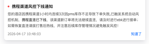 如因为房型库存不足导致直连失败订单大于等于3单时,携程直连将会自动下线断开,PMS系统右下角将会弹窗告知,内容如下,如需恢复直连上线,请联系PMS售后电话:010-57835586 有工程师协助处理